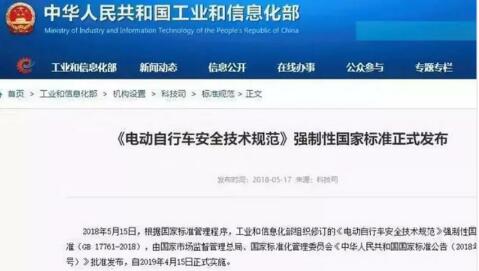 今年的5月17日,由國家市場監(jiān)督管理總局、國家標準化管理委員會批準發(fā)布的、新修訂的《電動自行車安全技術規(guī)范》出臺,將于2019年4月15日起實施。