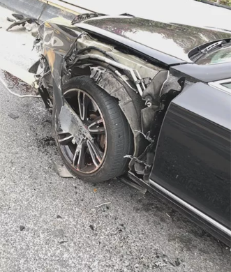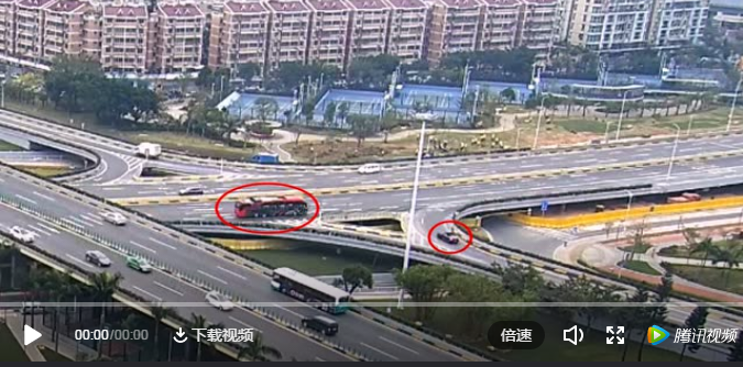 拱北交警梁警官迅速趕到現(xiàn)場,看到事故發(fā)生在前山立交二層右轉(zhuǎn)匯入主道路段,賓利小車水箱爆裂,左側(cè)車頭保險杠被掀起,上面還有好幾個大洞,地上都是碎片渣子。而停在幾米外的公交車,右后輪兩邊車身有長達一米的刮痕。▼