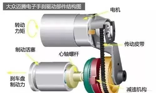 上圖是大眾邁騰的卡鉗式電子手剎驅(qū)動部件結(jié)構(gòu)圖。從結(jié)構(gòu)圖中我們可以看到電機(jī)、傳動皮帶、減速機(jī)構(gòu)、心軸螺桿以及制動活塞。