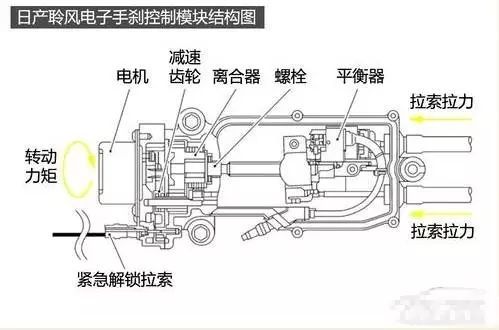 上圖是日產(chǎn)聆風(fēng)的拉索式電子手剎執(zhí)行機(jī)構(gòu)內(nèi)部結(jié)構(gòu)圖。從結(jié)構(gòu)圖中我們可以看到電機(jī)、減速齒輪組、離合器、螺紋軸、拉索平衡器以及緊急解鎖拉索。