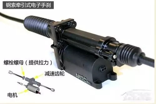 鋼索牽引式電子手剎的制動執(zhí)行機(jī)構(gòu)與傳統(tǒng)手剎無異,同為制動蹄式,只是把手動的拉索改為電動形式。正是因?yàn)殇撍鳡恳诫娮邮謩x的加裝成本低,因而更利于車型的設(shè)計(jì)變更。